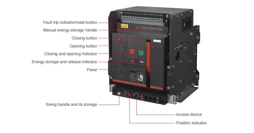 2. Выдвижной автоматический выключатель в основном состоит из контактной системы, изоляционного основания, интеллектуального контроллера, механизма ручного управления, механизма электрического управления и выдвижного основания.