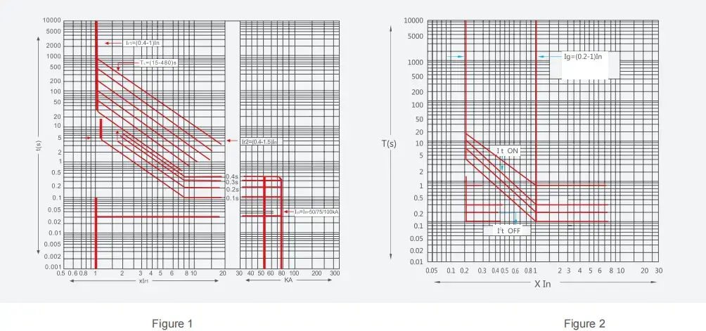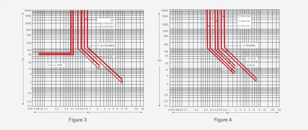 b. Обратно-временная характеристика срабатывания защиты от перегрузки по току с большой задержкой составляет TL=(1,5Ir)2t1, а время срабатывания при (1,05~2,0)Ir показано в таблице 4. Погрешность по времени составляет ±15%.