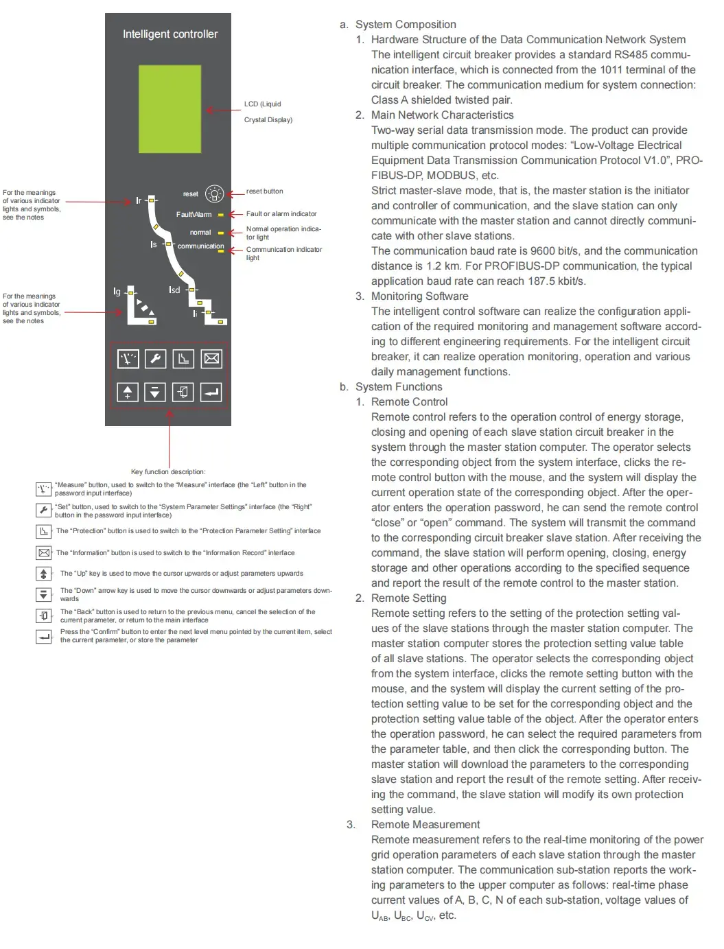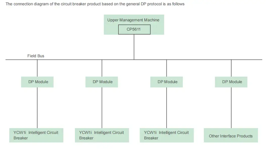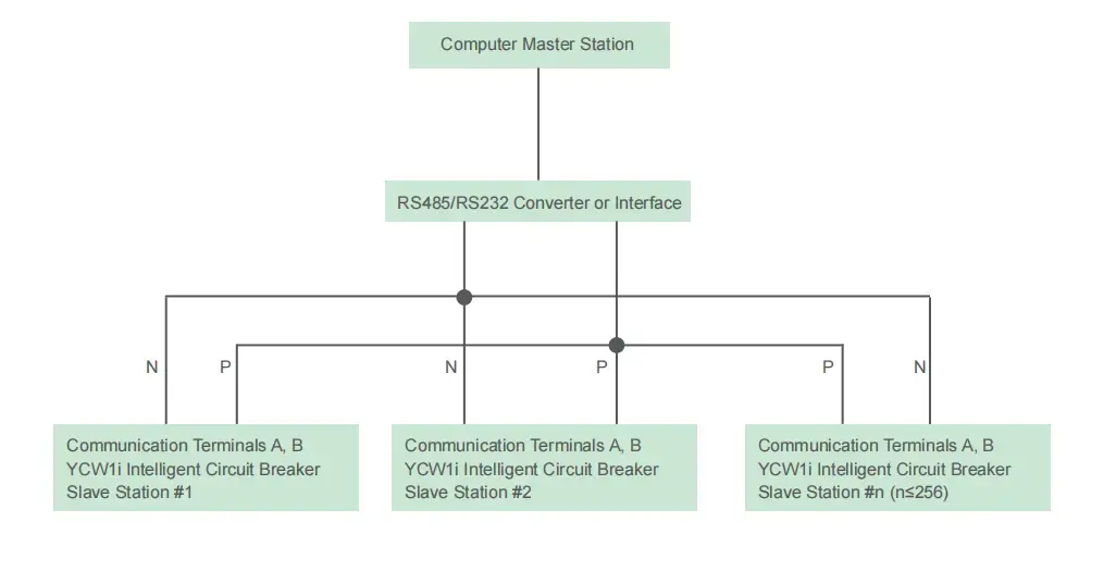 В дополнение ко всем функциям типа M, он также оснащен последовательным интерфейсом связи. Через этот интерфейс связи может быть сформирована структурированная сетевая система типа «ведущий-ведомый» (далее именуемая системой). Система состоит из 12 компьютеров в качестве ведущей станции и интеллектуальных автоматических выключателей или других коммуникационных компонентов в качестве ведомых станций. Структура сети системы следующая: для блока автоматических выключателей система может реализовывать функции удаленного управления («наш-удаленный»): мониторинг различных параметров электросети и параметров работы, отображение текущего рабочего состояния интеллектуального автоматического выключателя, настройка и загрузка различных параметров защиты, а также управление включением/выключением интеллектуального автоматического выключателя. Система подходит для создания и модернизации систем мониторинга распределения электроэнергии на различных электростанциях, электростанциях, средних и малых подстанциях, промышленных и горнодобывающих предприятиях, зданиях и т. д.