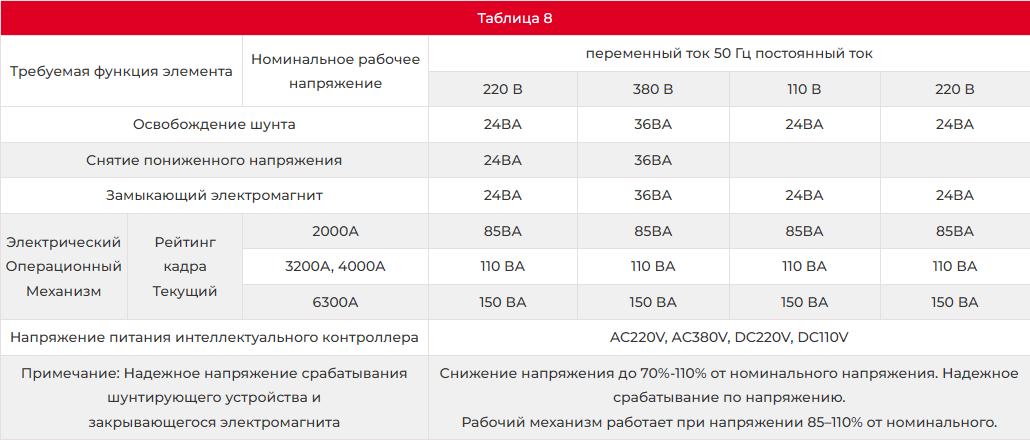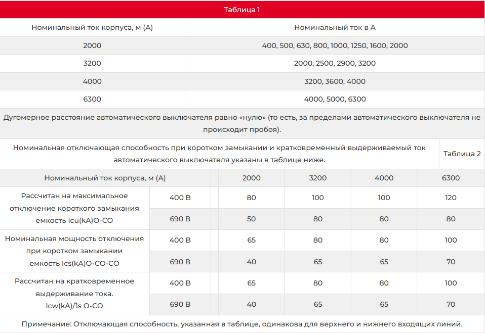 Номинальный ток автоматического выключателя указан в таблице ниже.