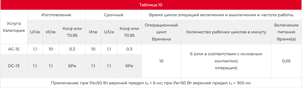 Пропускная способность вспомогательного контакта при включении и выключении в нормальных условиях эксплуатации.